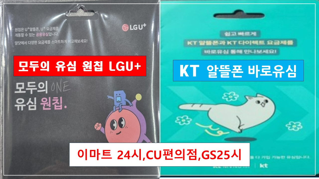 - 앤 텔레콤은 LG U+ 는 모두의 원칩이라는 모델명의 흙색 포장지에 쓰여 있습니다. KT는 파란색 포장지에 바로유심이라는 모델명의 적혀 있습니다.
