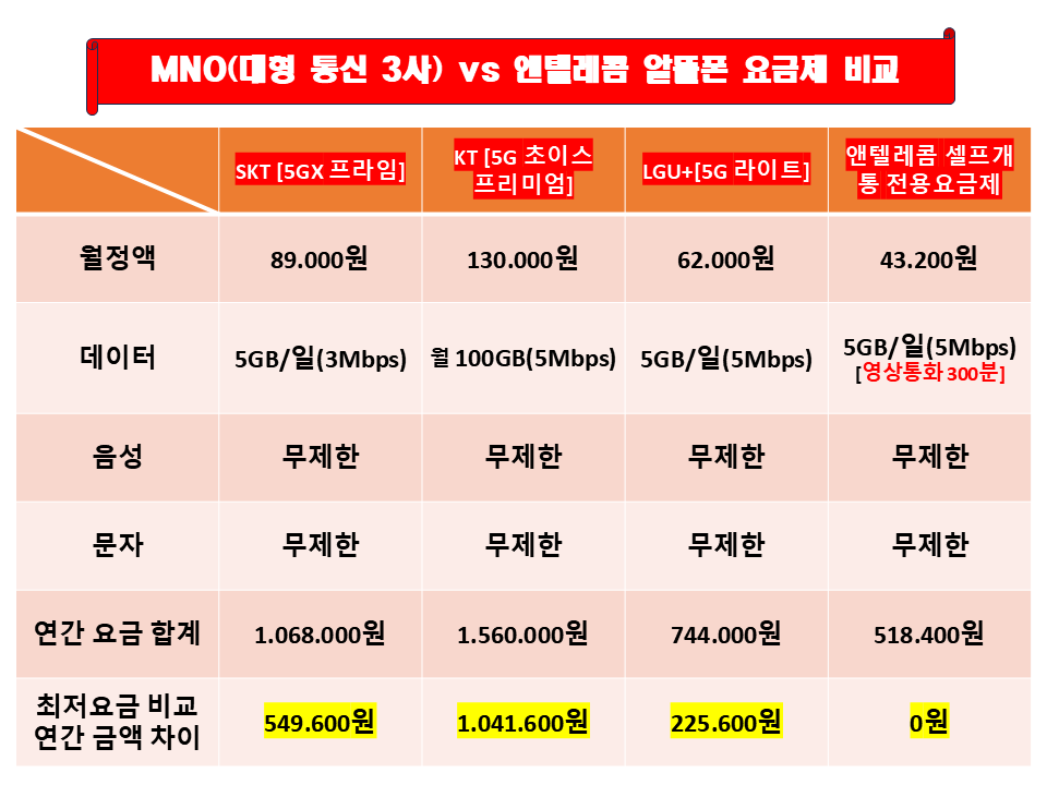 25년의 역사를 가진 알뜰폰 통신사 앤텔레콤 요금제를 알려드릴게요. 이번에 출시된 앤 플랫폼 셀프개통 전용 앱 알뜰폰 유심 데이터 무제한 요금제 중에 월 43.200원 요금제 매일 5기가(5Mbps)를 중심으로 대형통신 3사와 요금제를 비교해 보겠습니다.